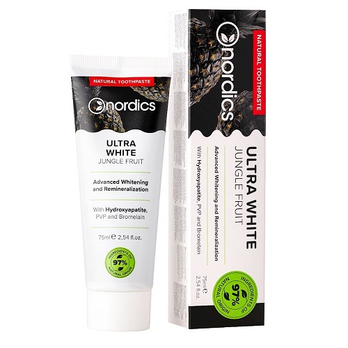 This toothpaste contains hydroxyapatite (also known as liquid enamel) and bromelain (a pineapple enzyme). The formula effectively whitens teeth and remineralizes enamel.