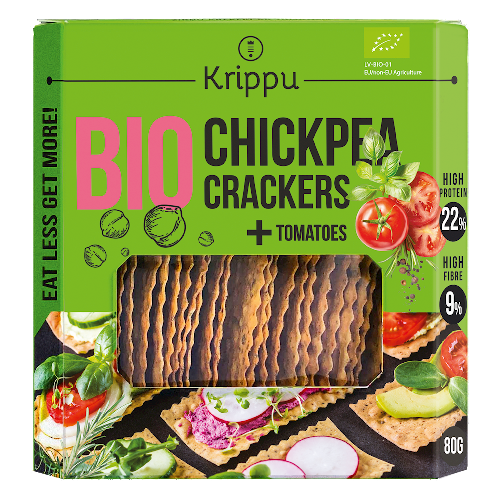 KRIPPU chickpea crackers contain over 20% protein, making them among the highest protein-content products in terms of nutritional value.