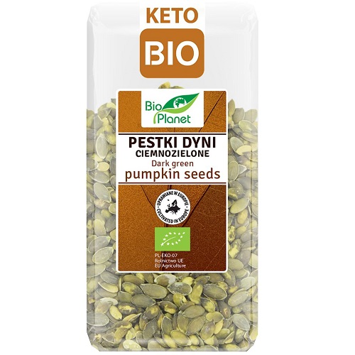 ინგრედიენტები: მუქი მწვანე გოგრის თესლი* 100% (*სერთიფიცირებული ორგანული ინგრედიენტი).  კვებითი ღირებულება 100 გ-ზე: ენერგეტიკული ღირებულება- 2289 კჯ / 552 კკალ ცხიმები – 42 გ, გაჯერებული ცხიმოვანი მჟავების ჩათვლით – 7,0გრ ნახშირწყლები – 3,2 გ შაქრის ჩათვლით – 2,8გრ ცილები – 36 გ მარილი – 0გ.   შენახვის პირობები:  შეინახეთ მშრალ და ბნელ ადგილას. მწარმოებელი: Bio Planet. წარმოების ქვეყანა: პოლონეთი.   იმპორტიორი საქართველოში: შ.პ.ს ორგანიკა, თბილისი, ვაჟა ფშაველას გ. 51, ირ. აბაშიძის 61, +995551977887, 405172316, www.organika.ge
