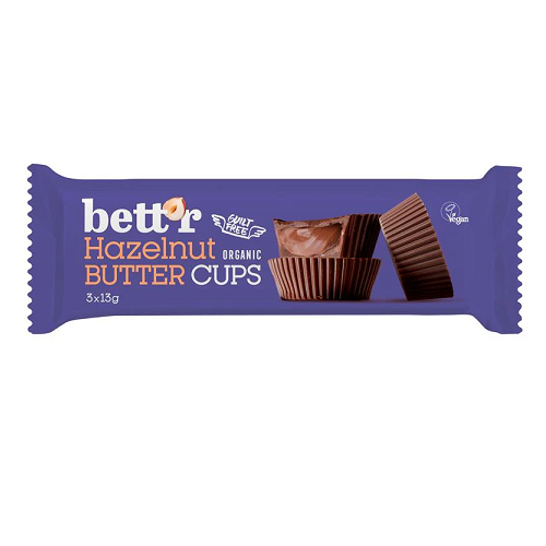 Bett’r Organic Hazelnut Butter Cups. A fine little dessert of hazelnut butter coated in vegan chocolate. To further enhance the tempting taste, a small pinch of salt is added for the finishing touch. 3 cups to share with friends.